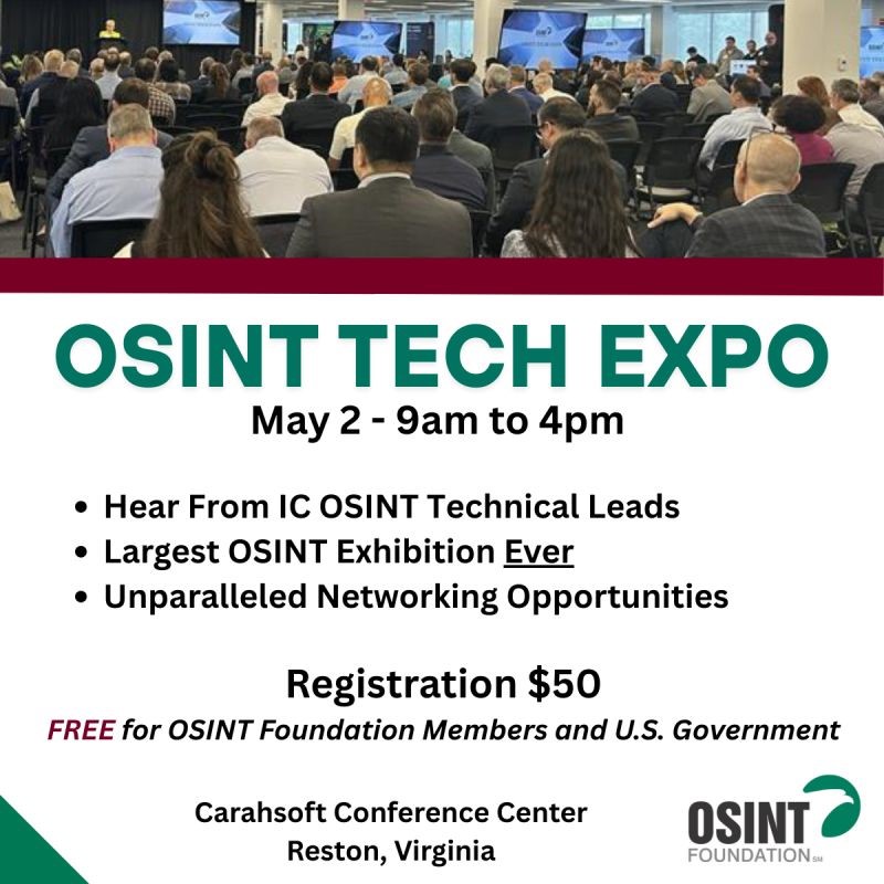 Imitated But Never Duplicated - The OSINT Tech Expo on Friday, May 2nd. Registration is $50 per person or FREE if you are an OSINT Foundation member or military/government. Hear from Intelligence Community OSINT technical leads and see the largest assembly of OSINT related exhibitors ever. Attendance is restricted to U.S. Citizens and foreign government personnel sponsored by the U.S. Intelligence Community.
