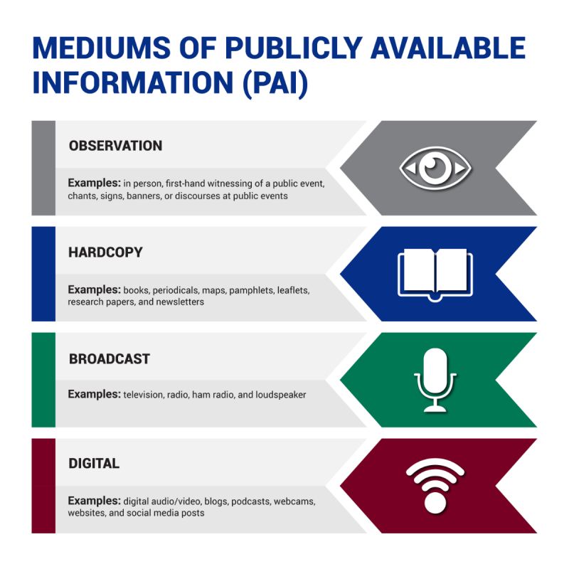 The following four mediums represent the totality of the PAI environment at this time. As the discipline evolves, additional mediums may be added. The examples provided should not be viewed as a comprehensive listing but rather selective examples to aid in comprehension. The mediums are ordered chronologically even though the Practitioner Committee acknowledges that digital is the largest and most common medium. While most OSINT practitioners focus on digital exploitation, a working knowledge of the other PAI mediums is essential. As commercially available information (CAI) is a subcomponent of PAI (see OSINT Foundation OSINT Definitions document), the following also applies to CAI.