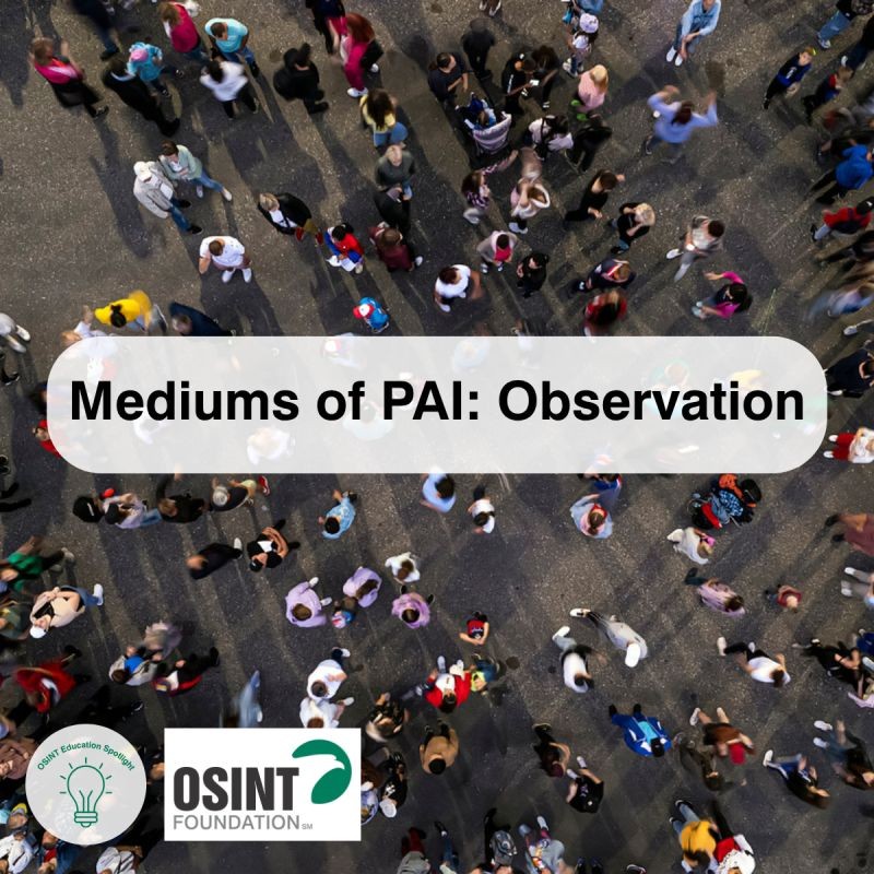 That which must be observed in person, first-hand; it is experiential in nature. To be in this category, the information must not have been collected by any other means. Observation is the oldest of PAI categories, and as the PAI definition states can be either seen or heard by any casual observer at a meeting or event open to the public. Examples include chants, signs, banners, or discourses at a public demonstration; first-hand witnessing of a public event or incident; and observing an individual’s tattoos or identifying features in a public setting.
