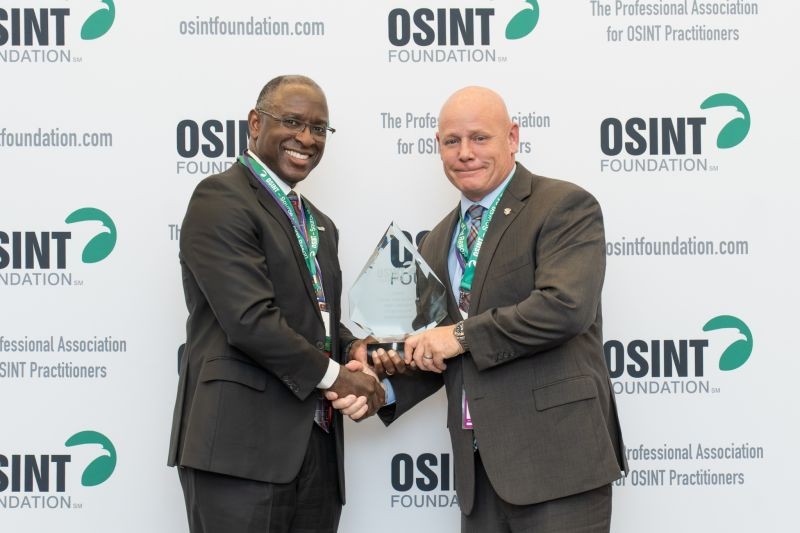 The IC OSINT Innovation of the Year Award was presented to the US Army Asian Studies Detachment, for the CITROS platform. The Innovation Award is presented for the novel technique, process, or platform that is at the unclassified level, derived from U.S. Government technology, and which has demonstrably improved the effectiveness of the OSINT discipline and significantly impacted the national security of the US. Accepting the award on behalf of the Asian Studies Detachment was Anderson Sale, Director of Operations for the Army's Intelligence and Security Command. Presenting the award was OSINT Foundation Advisory Board member Everette Jordan.