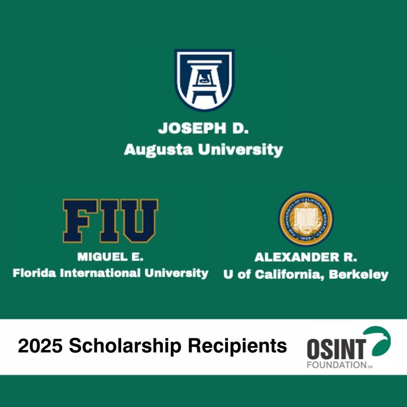 The OSINT Foundation, the professional association for Open-Source Intelligence practitioners, is committed to supporting emerging young professionals and the next generation of OSINT practitioners though scholarships, mentoring, and providing student memberships that enable a “bird’s-eye view” of the discussions and activities of experienced OSINTers. Please join us in congratulating our 2025 recipients of the OSINT Foundation scholarship!